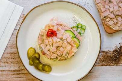 aszpik(44%), ivóvíz, zselatin (marha), étkezési só, cukor, savanyúságot szabályozó anyag (citromsav), ételízesítő, ízfokozók (nátrium-glutamát, dinátrium-inozinát, dinátrium-guanilát), cukor, szárított zöldségporok (sárgarépa, paszternák, vöröshagyma, burgonya, petrezselyem levél), dextróz, kukoricakeményítő, fűszerek, színezék (riboflavin), tartósítószer (nátrium-nitrit), főtt sonka(36%){sertéshús (80%), ivóvíz, étkezési só, sűrítőanyag (feldolgozott Euchema moszat), emulgeálószerek (trifoszfátok, polifoszfátok), dextróz, antioxidáns (nátrium-eritro-aszkorbát), tartósítószer (nátrium-nitrit), csemege ízesítésű uborka(20%)} {uborka, ivóvíz, étkezési só, szilárdító anyag (kálcium-klorid), tartósítószer (nátrium-benzoát, kálium-szorbát), étkezési sav (ecetsav), édesítőszer (szacharin), fűszerolaj}.